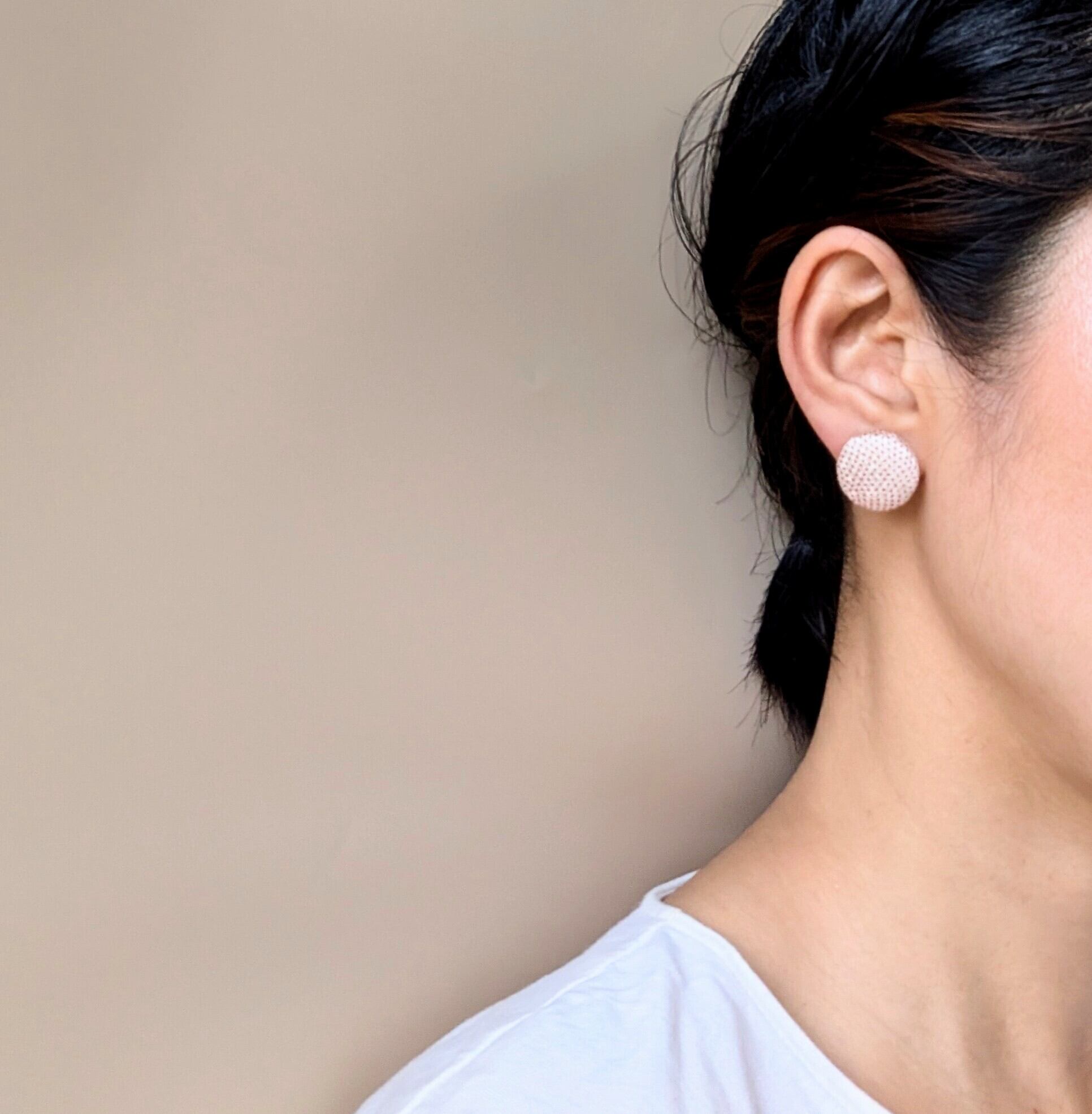 上品で華やかな光沢感のある生地に、愛らしいピンクのドットが眩しいピアスです。