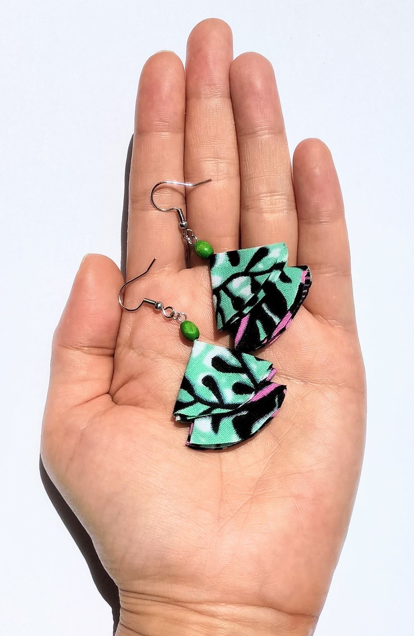 鮮やかなグリーンとビビットピンク、黒い枝模様が軽やかに風に揺れるピアス♪