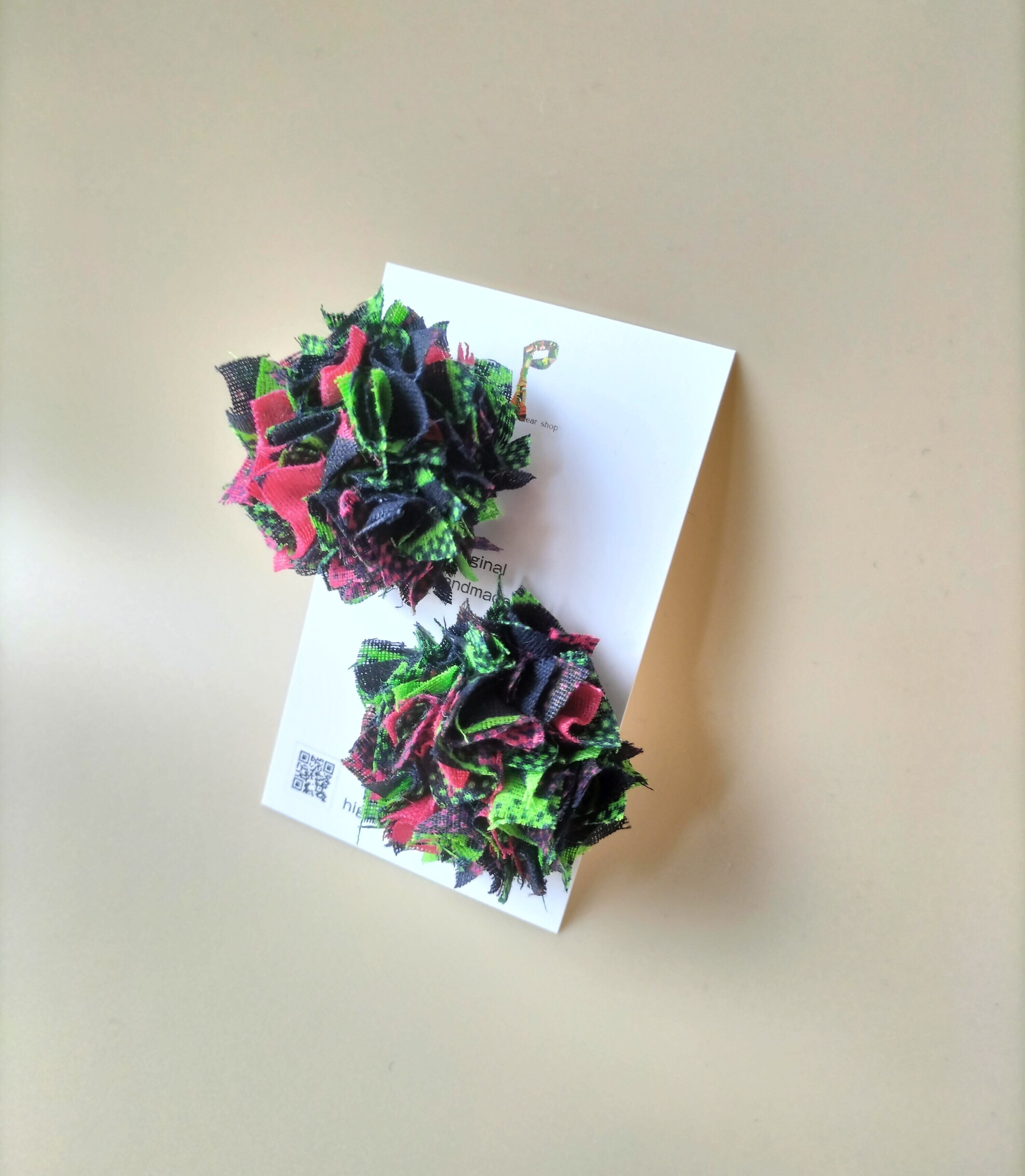 黒ベースの生地に赤みがかった紫、緑、それぞれがドットになっている部分、それが組み合わさって、黒ベースでも華やかな印象になっています♪