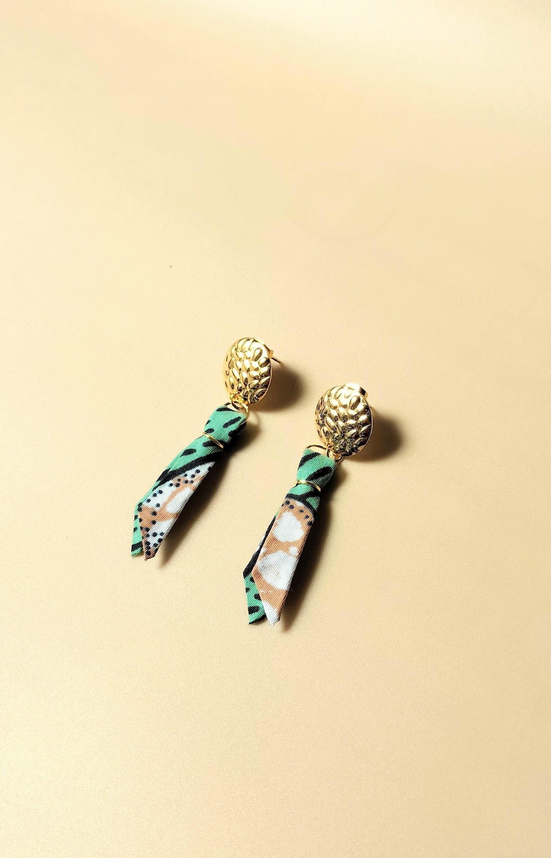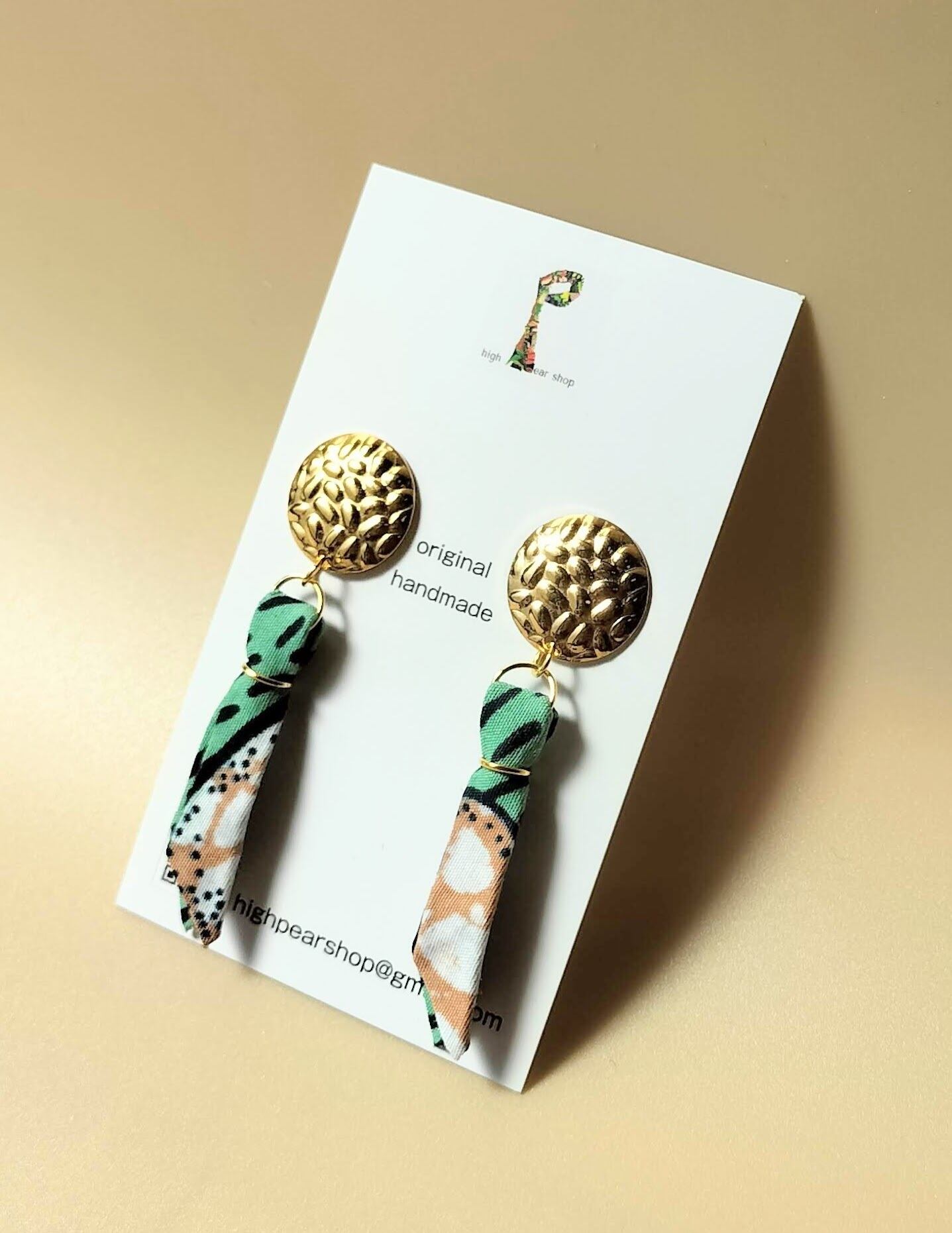 くすみ系グリーンと淡いベージュが鮮やかなタッセルピアス。