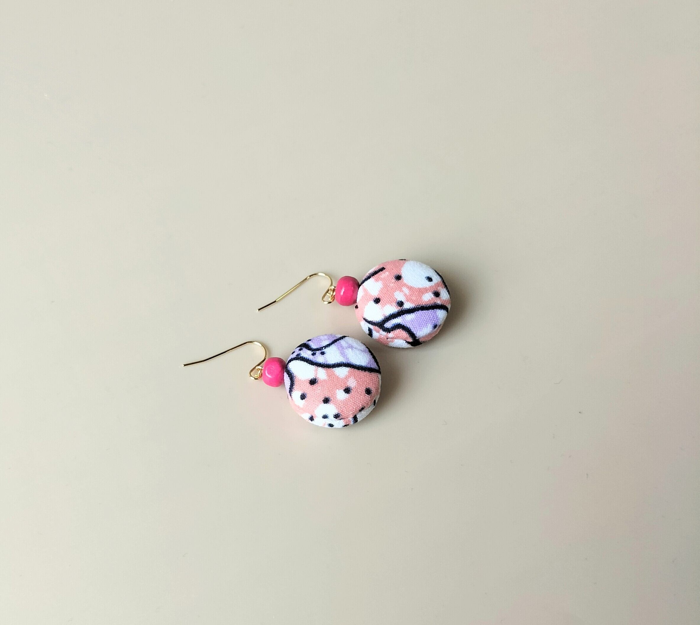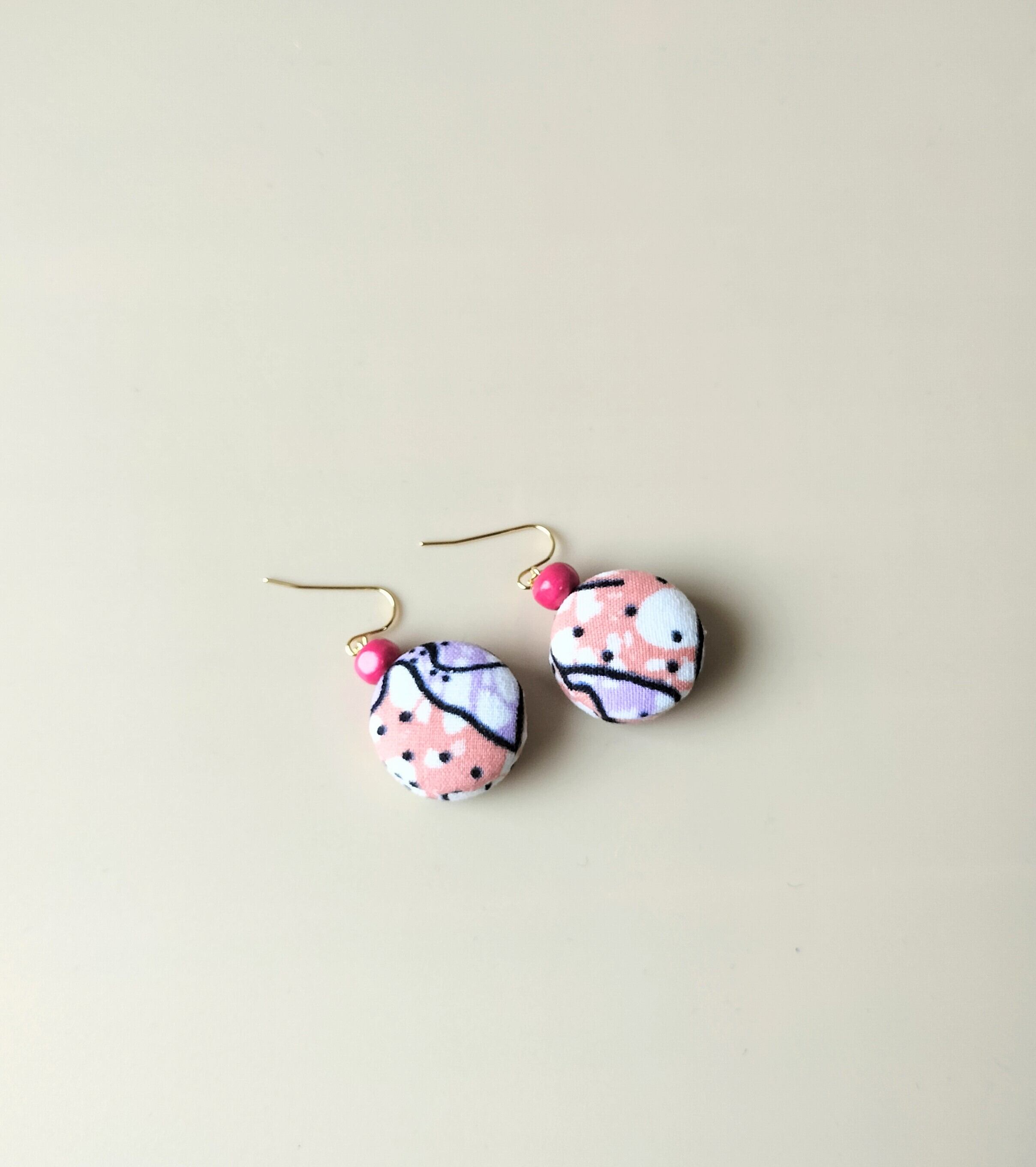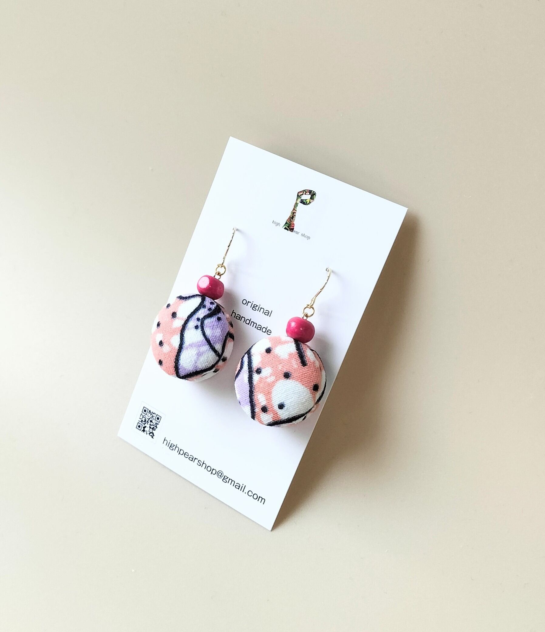 柔らかなピンクと紫の布にコロンとしたシルエットが可愛らしいピアス♪