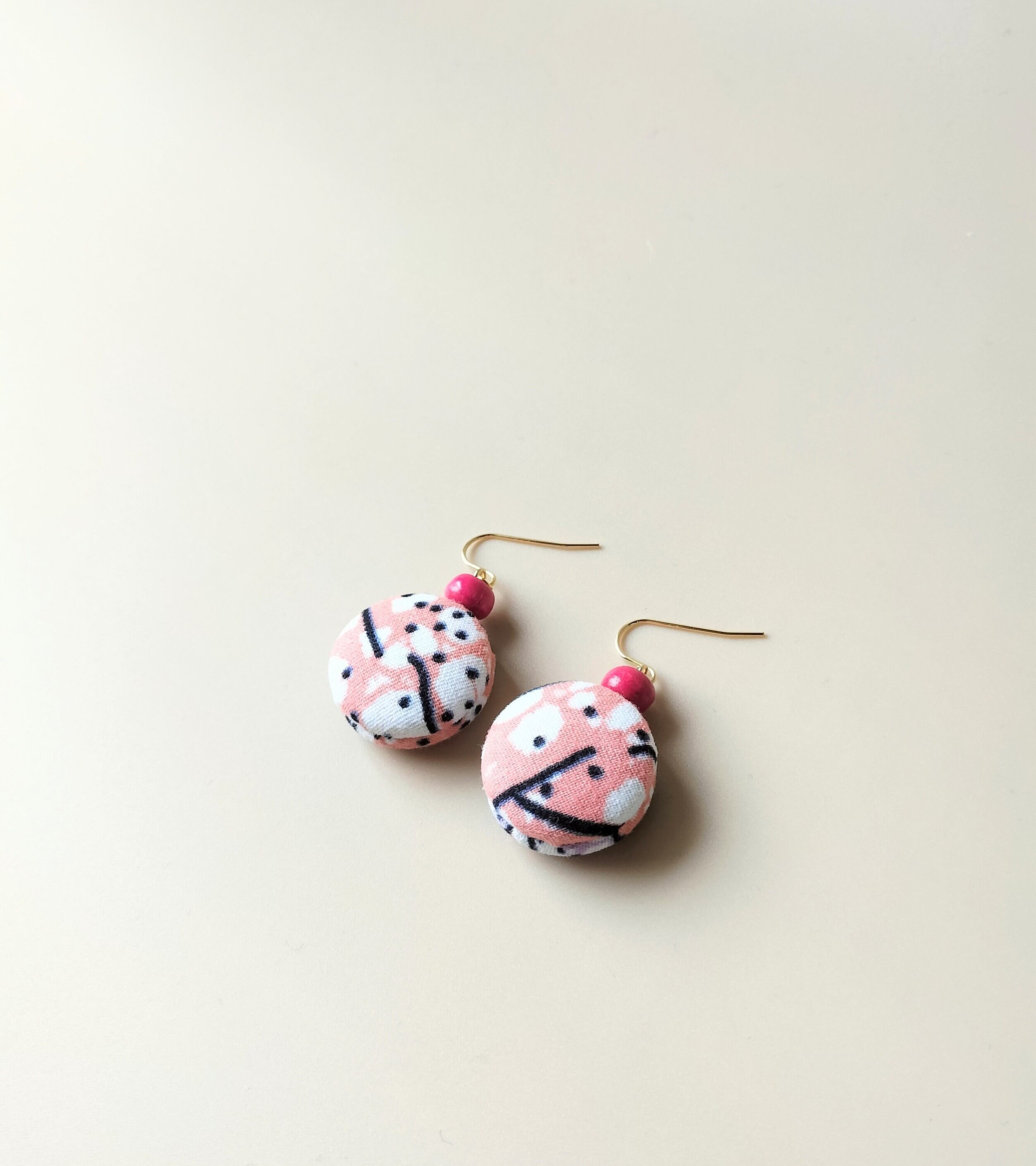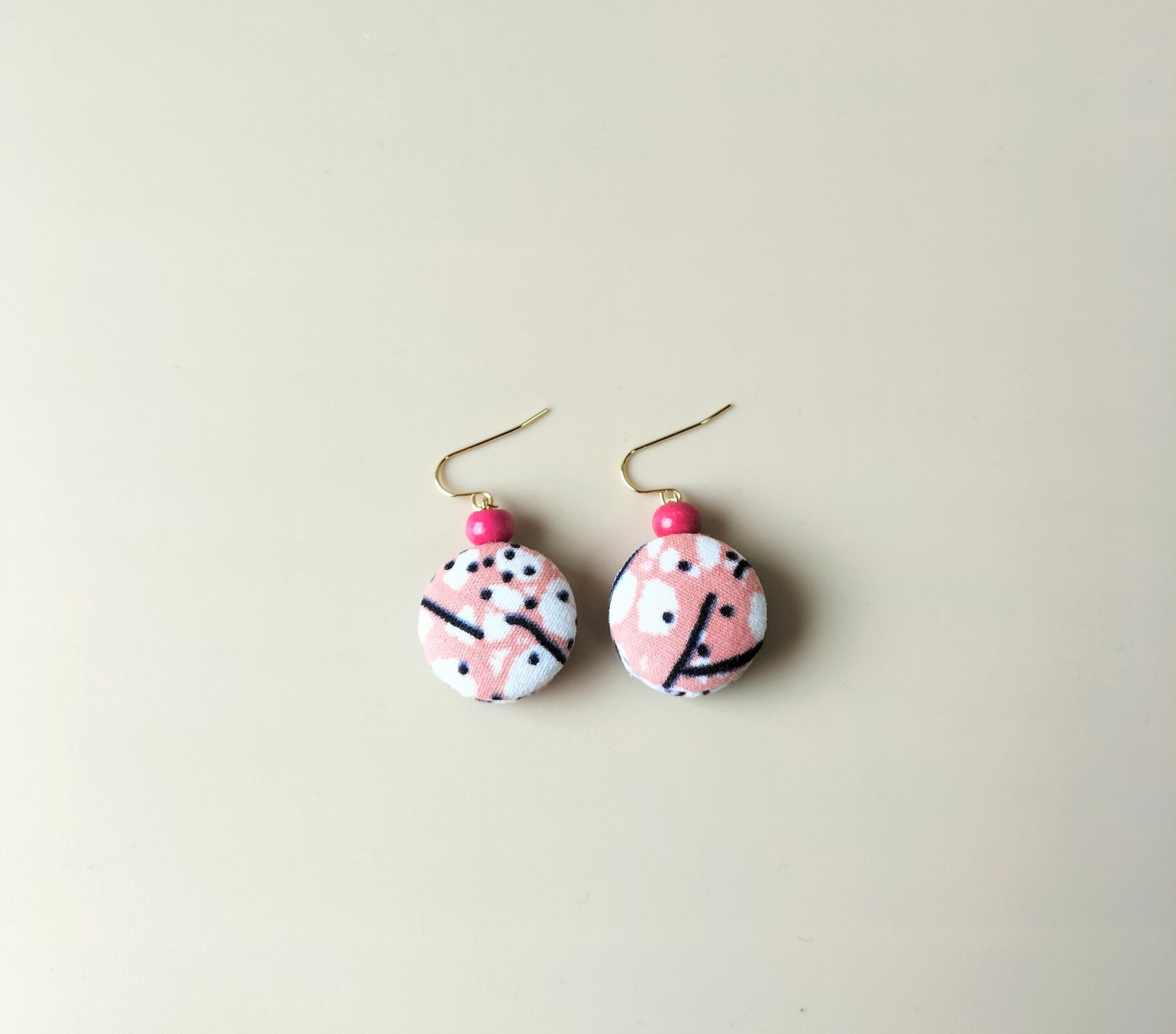 アフリカ布では珍しい柔らかい色合いとビビットなピンクのウッドビーズが顔周りを華やかにしてくれます.*・゚