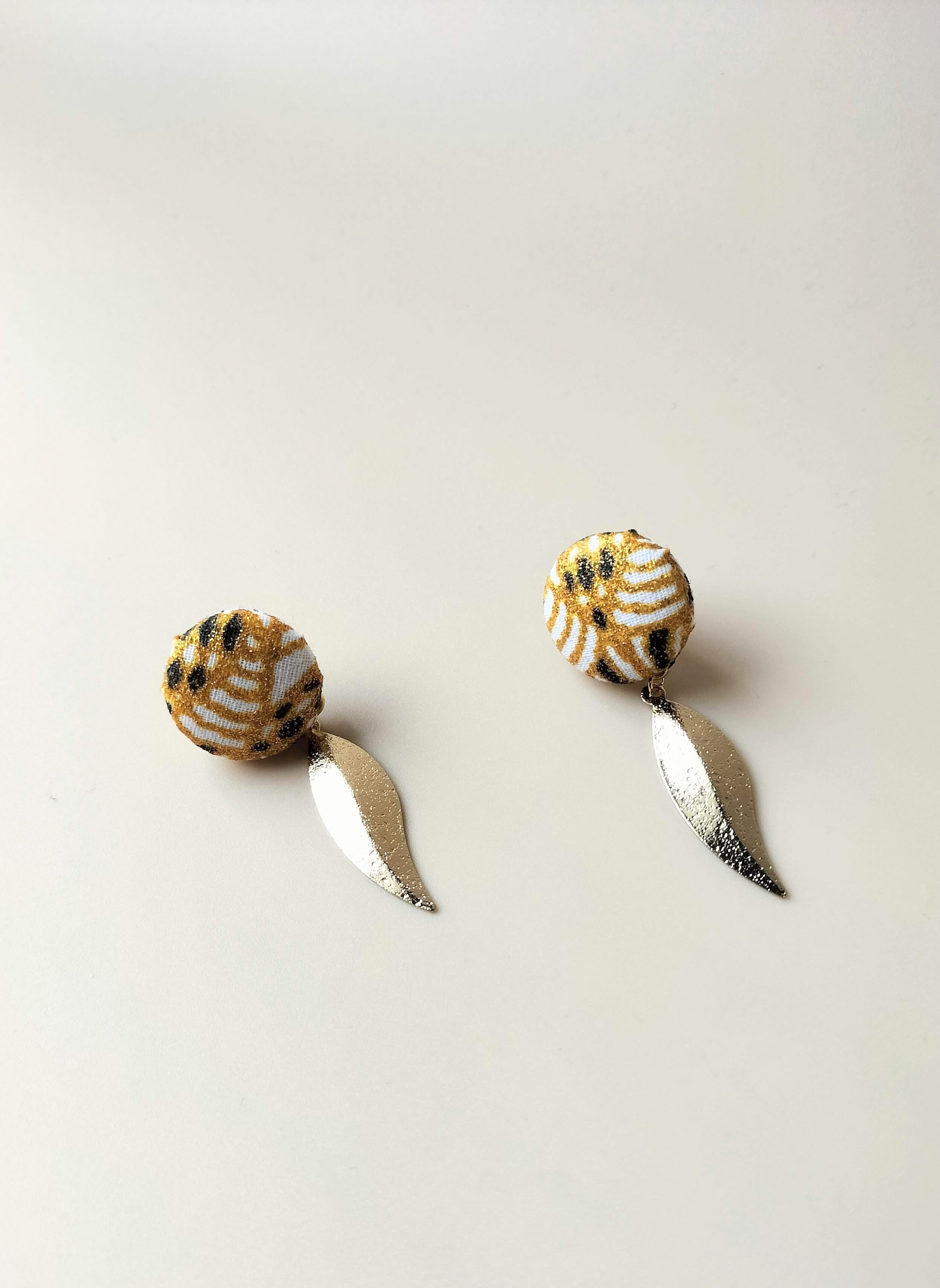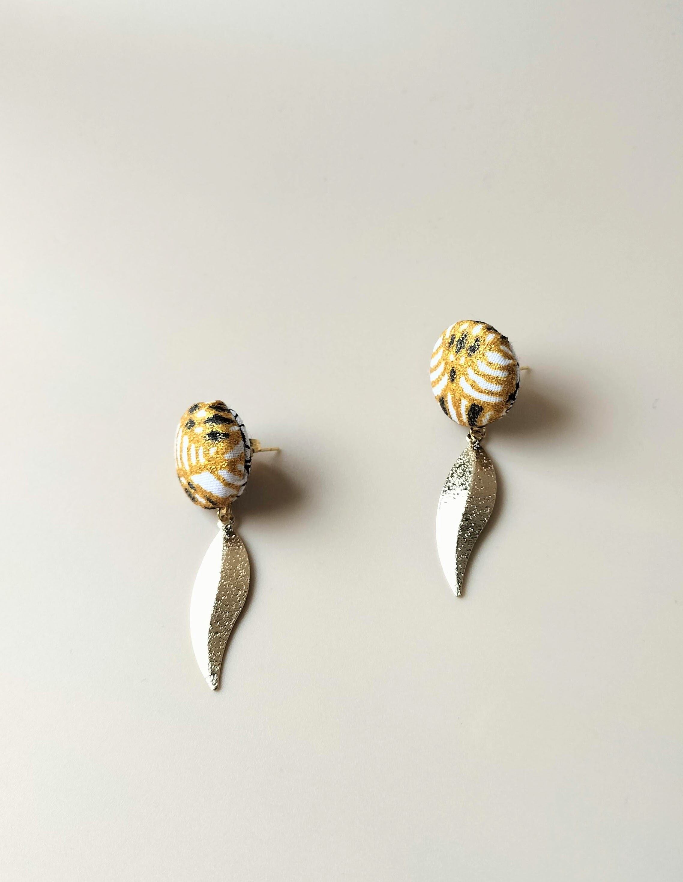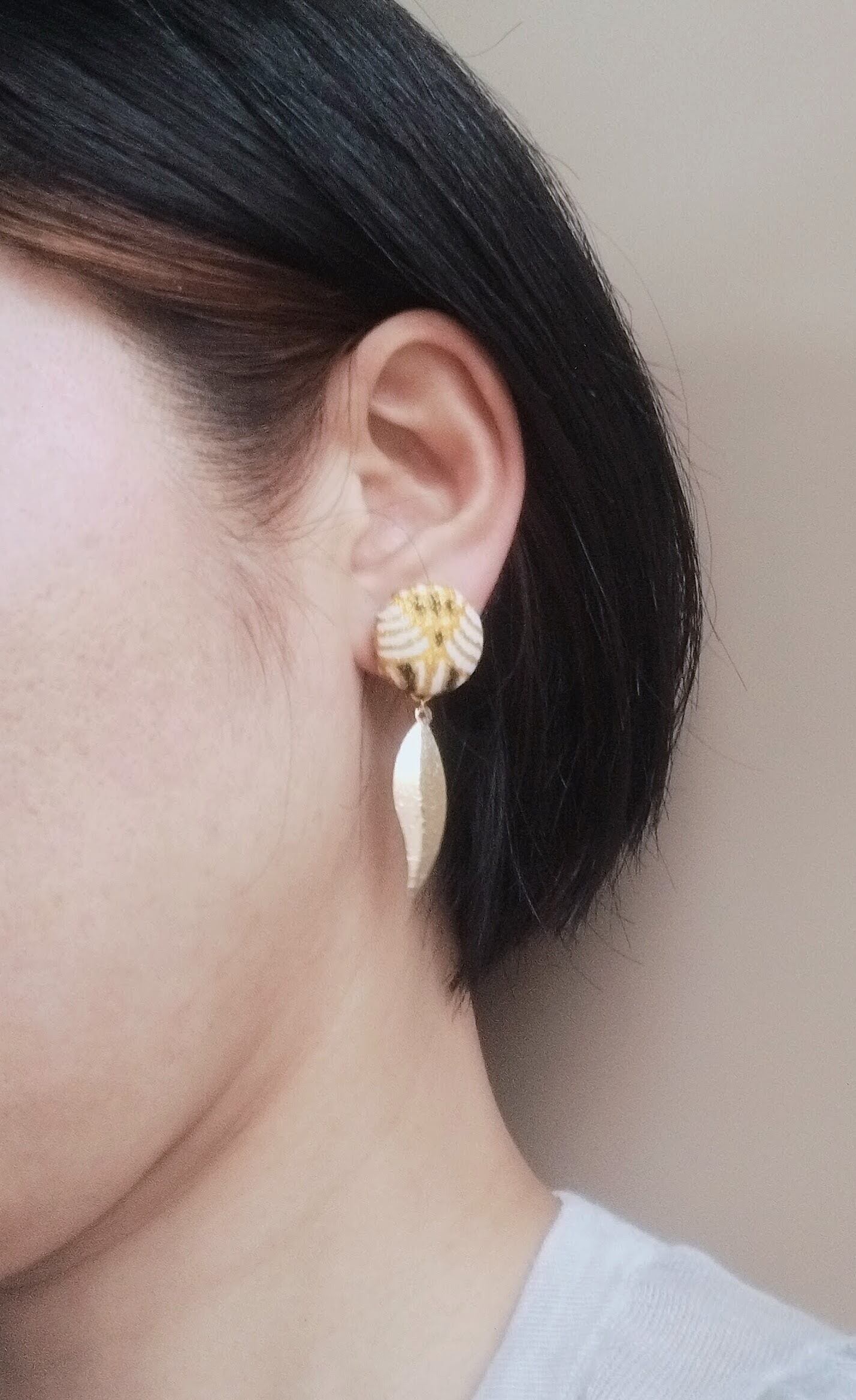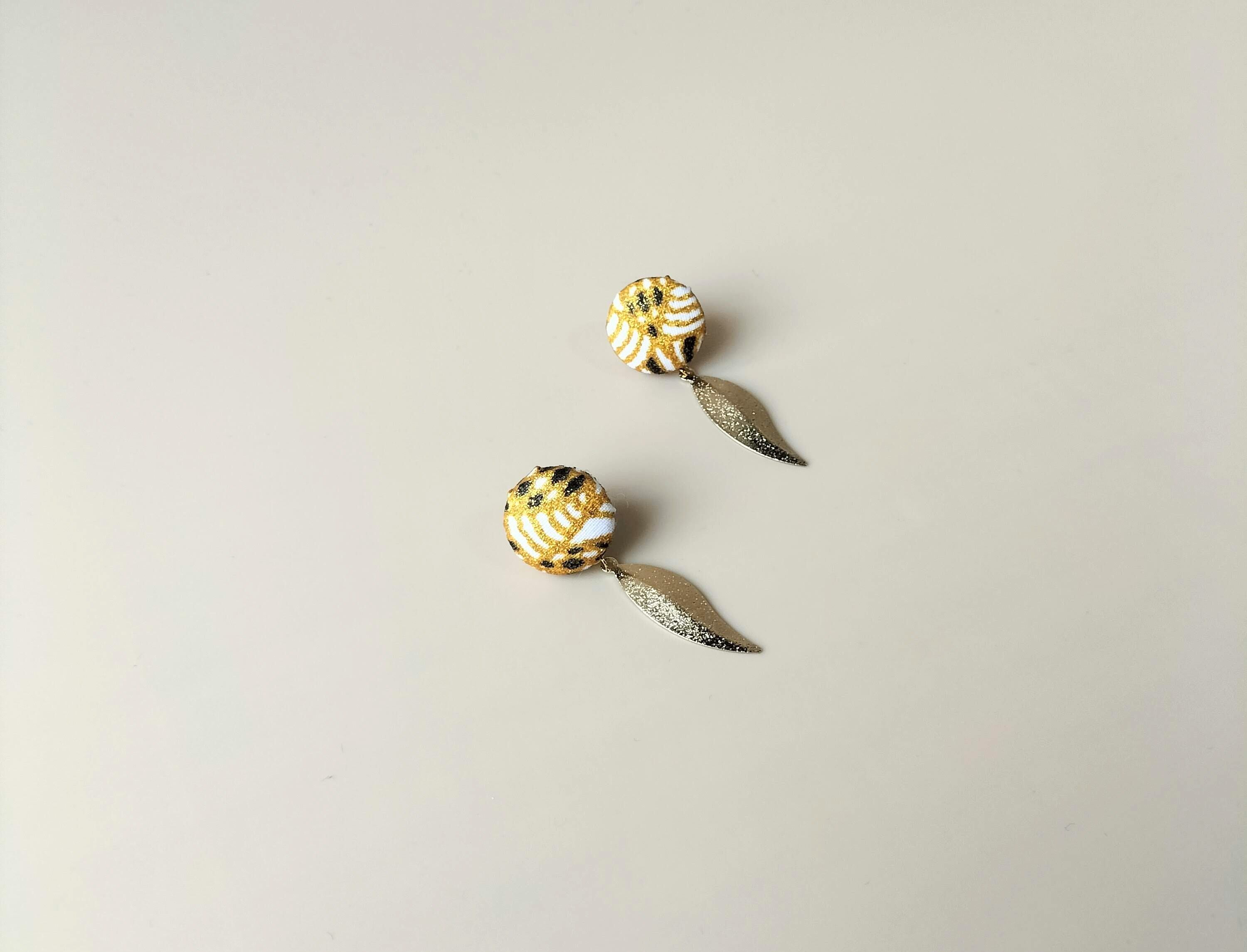 白ベースにゴールドと黒が綺麗なくるみボタンにユラユラ揺れるチャームのピアス.*・゚