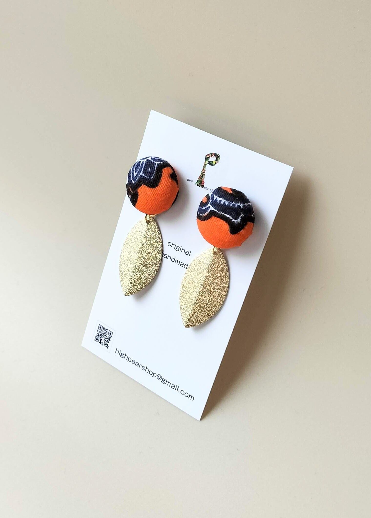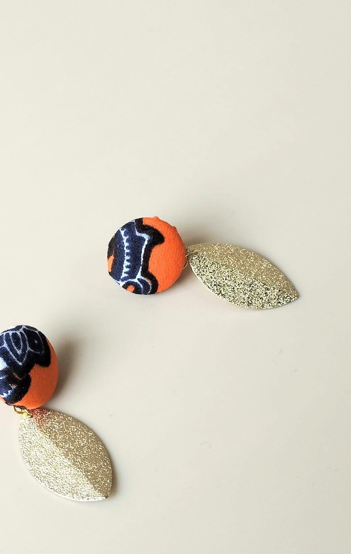 鮮やかなオレンジに紺色と白のお花柄が切り取られたくるみボタン&ぷっくりチャームピアス°・*:.。.☆