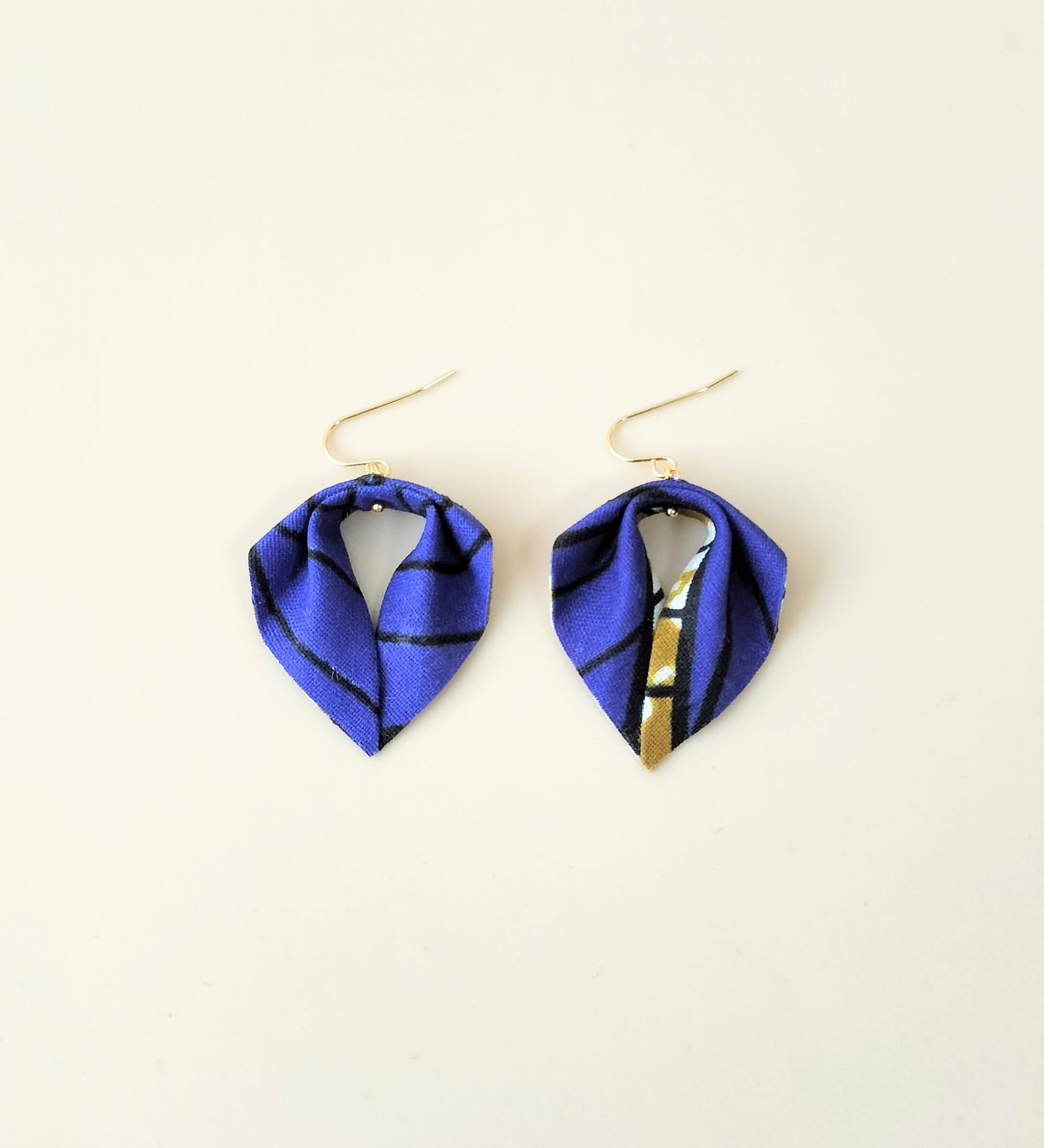 アフリカの大地をイメージする色とと夜空のような深い青の生地を折り紙のように重ねて、リーフのように仕上げました。
