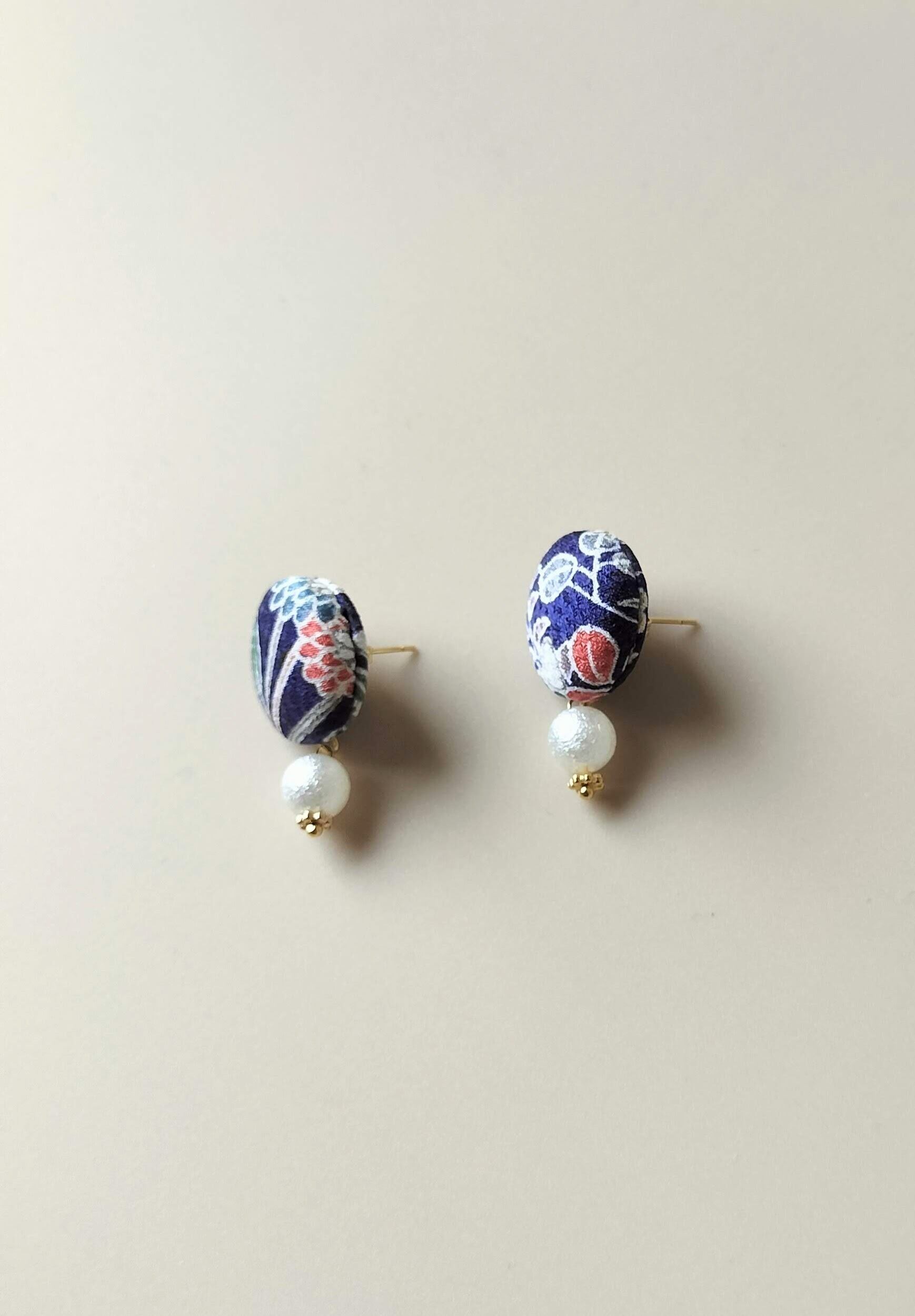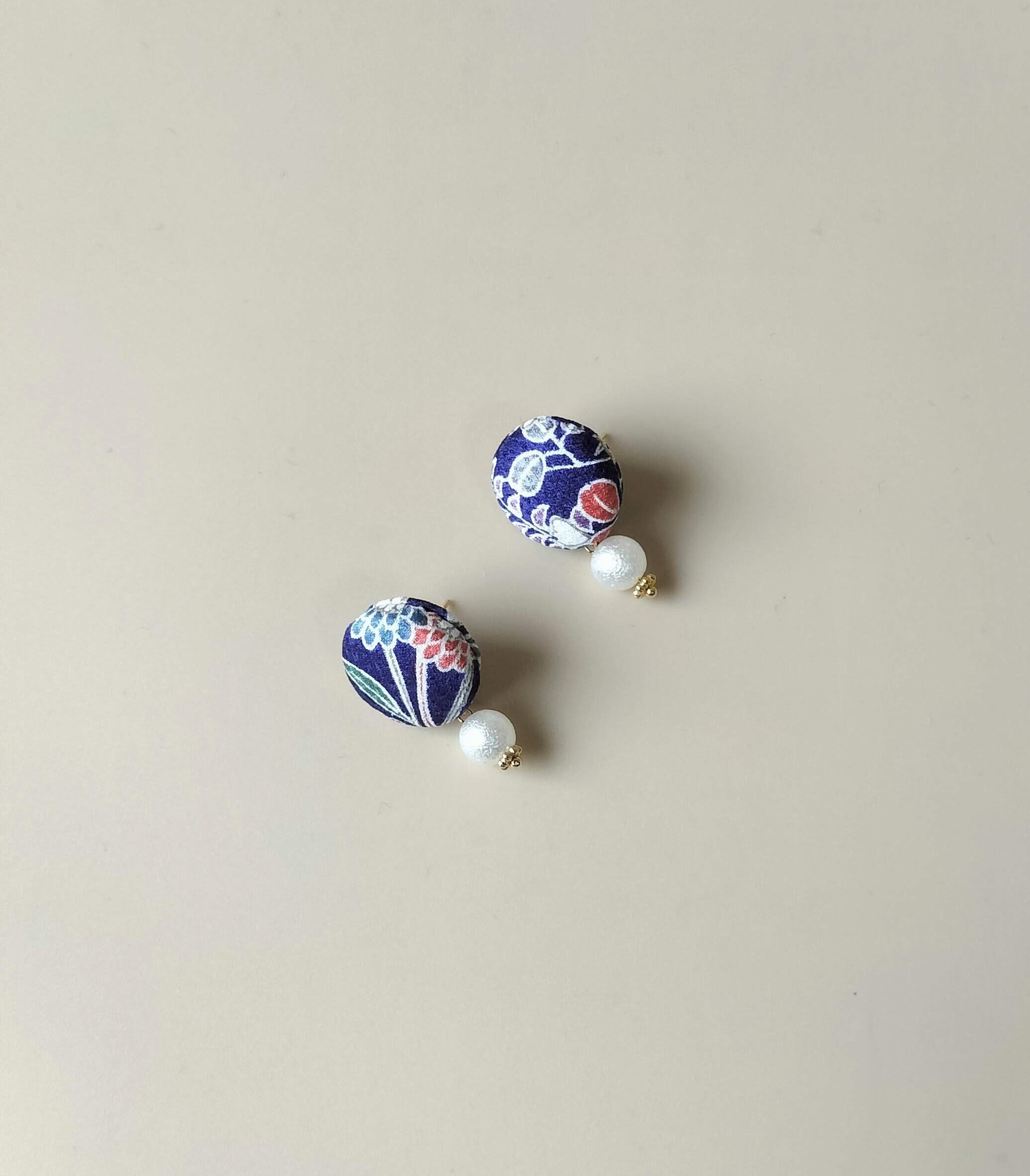 紺色ベースに鮮やかな赤や紫、緑の葉っぱ模様が顔周りを華やかにしてくれます。
